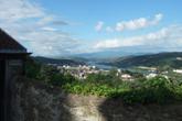 Der Wind hat wieder klar Schiff gemacht - die Gewitterwolken sind verschwunden. Die Sonne lacht, als wenn nichts gewesen wäre. Wir klettern hoch zur Kirche. Dahinter liegt der nach Westen abschüssige Friedhof mit Talblick. Außerdem sehen wir Reste der Stadtbefestigung und das, was vom ehemaligen Schloss noch übrig ist.
